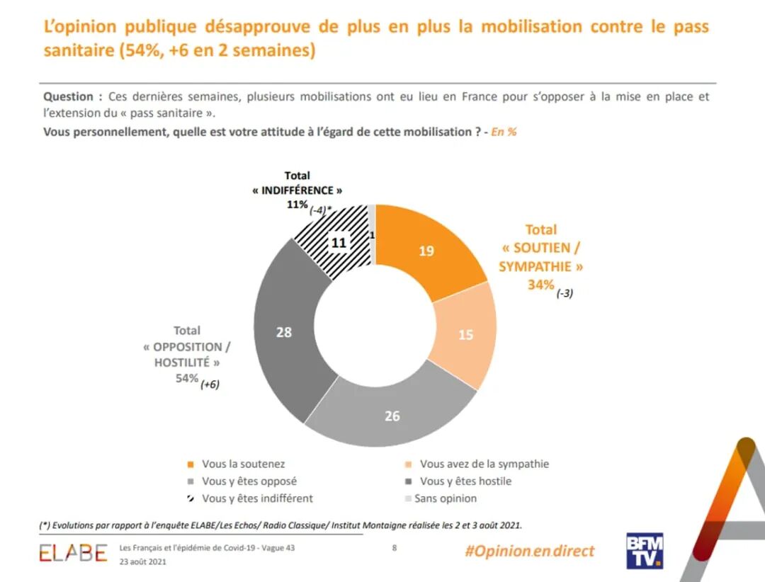 与此同时,也有越来越多的法国人不愿再和健康通行证的反对者们站在“同一战线”:据法国BFMTV最新发布的民调显示,有54%的法国人不赞成反对健康通行证的示威活动,这一数字相比8月初的结果高出了6个百分点,而且还有持续增加的趋势。