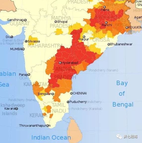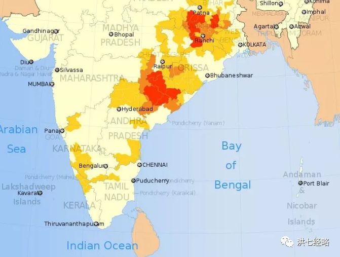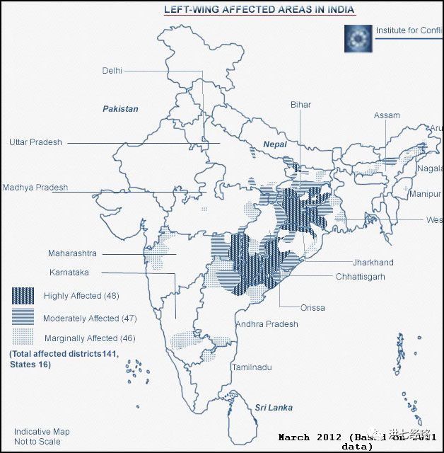 如今,毛派力量已经控制和影响着印度1.8亿人口,活动范围到达到18个邦,并建立一条“红色走廊”(颜色深浅代表力量强弱)。![]()