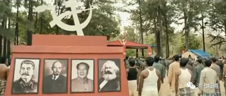 电影剧照:印共(毛)派的纪念墙,左起分别是斯大林、列宁、毛主席、马克思上图纪念墙上方就是人民解放游击军的标志,镰刀斧头加一把冲锋枪,美术角度看,不大美观简洁,但这就是印度。![]()