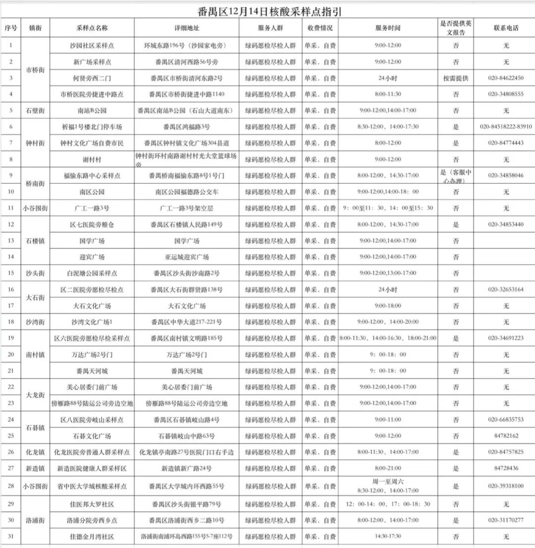 黄埔区12月14日绿码核酸检测点具体安排