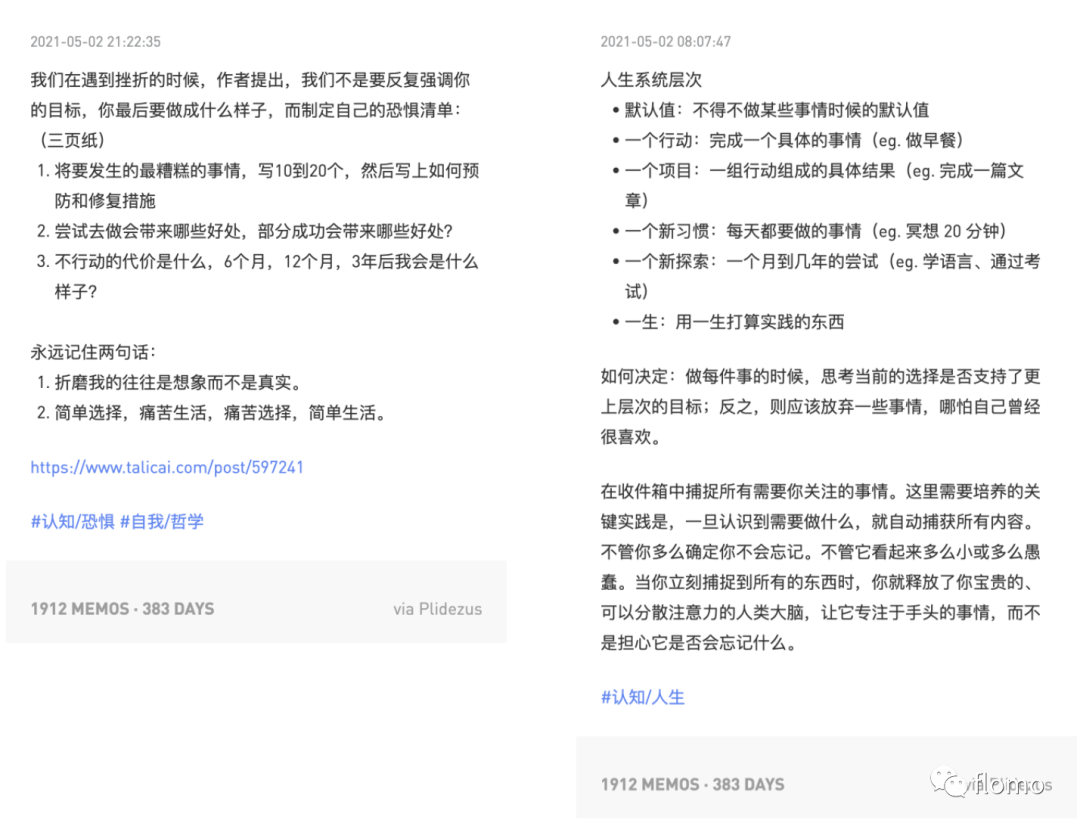 •输入:尽量多的捕捉下来自己想法和知识盲区,但避免无脑摘录。•输出:重要的不是文采,而是让自己内化知识,并获得高质量的反馈。