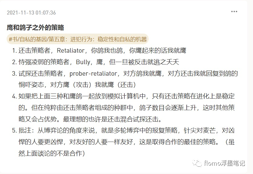 这是一张《自私的基因》的笔记卡片,是第五章的一部分的内容。