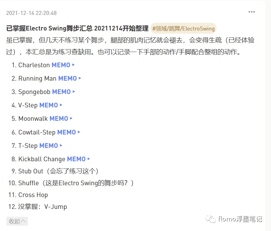 你可以发现,主题都是和我没有什么大关系的,北约与俄罗斯和我有什么关系对吧?领域对我来说是切身的。比如这个是我跳 Electro Swing 的技能笔记。