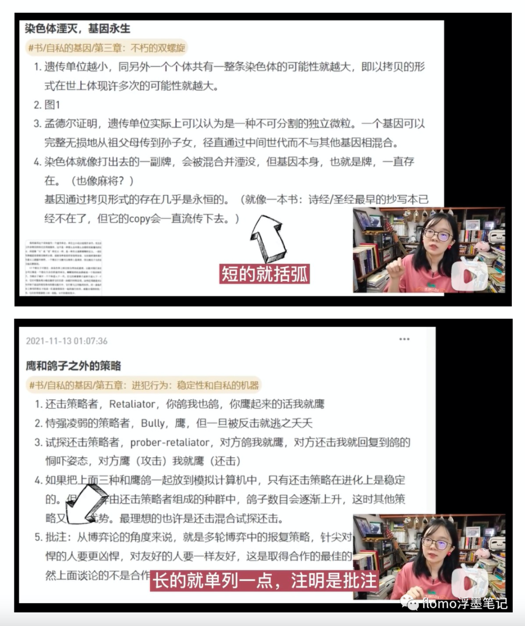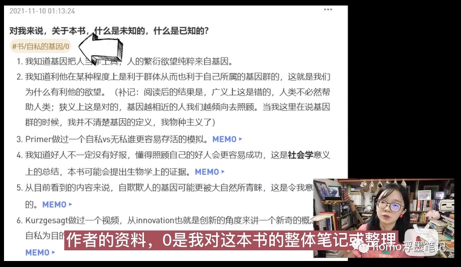 如果视频比较长,我会标明有关内容的时间点,方便我需要的时候进行回看。因为这个内容令我联想到了《自私的基因》这本书,于是我为它打上了这本书的标签。
