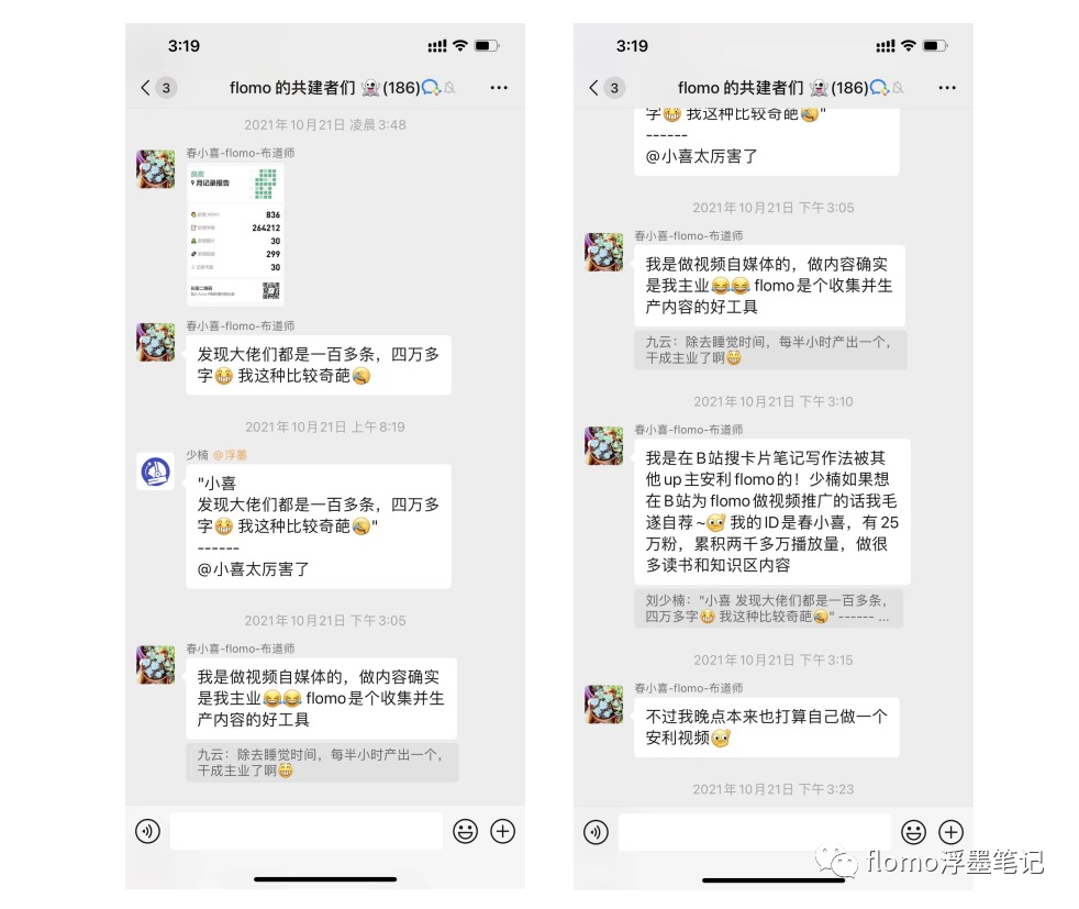 和小喜的相识完全来自于偶然,国庆的时候,flomo 第一次上线了月度统计报告,小喜在共建群里发出的 9 月总结惊呆了一众人 :