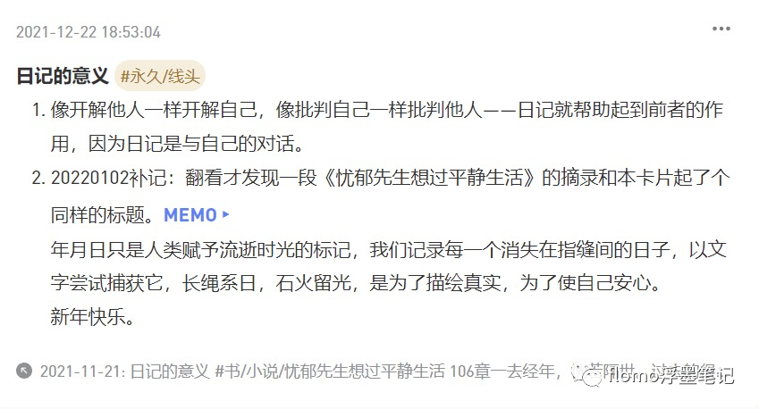 电子日记我是去年开始在 OneNote 里写的,之后转到 flomo 来。一天一张卡片,太长的话就分成两张。写日记的意义是什么呢?是为了将经历反刍、审视、自我开解、总结教训,是为了过一种深思熟虑的生活。