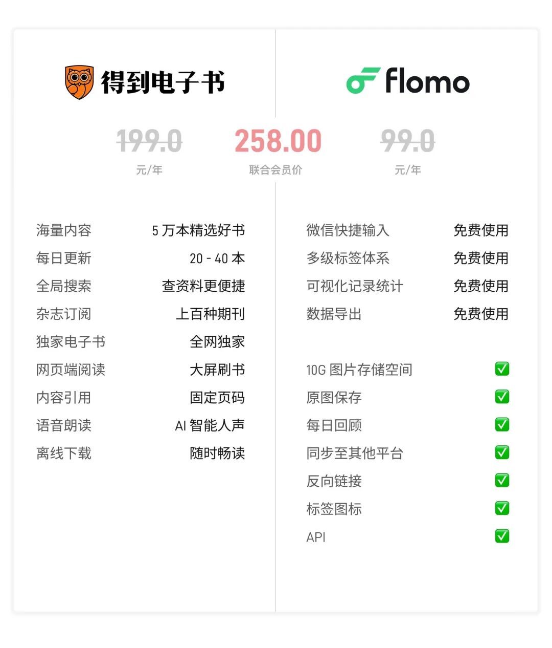 flomo + 得到电子书会员,原价 298 元,限时联合会员活动期间(6.28 - 7.24),优惠价格为 258 元(省 40 元),每天仅需 0.7 元,即可实现阅读自由和高效管理笔记。
