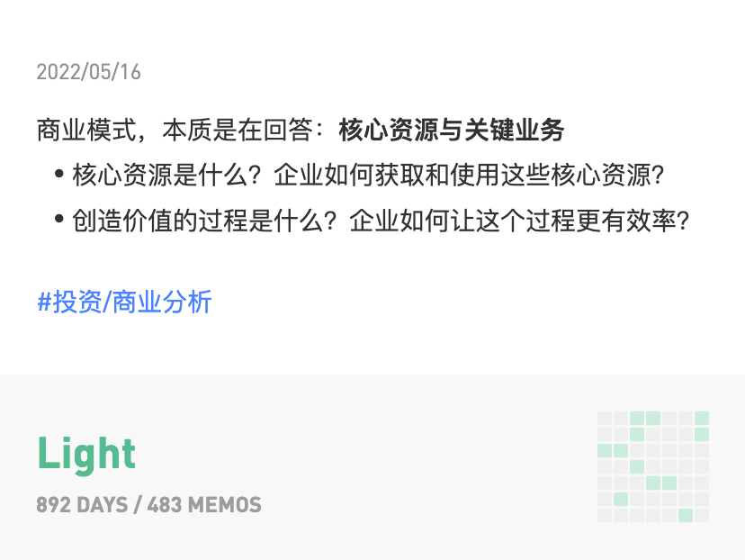 当我确认内化、修炼完成后,我通常会写一篇成体系的文字以作梳理,并删除 flomo 里的相关笔记。- 梳理体系文字,是为了进一步梳理内在逻辑、加深理解。我写的每一篇文章,虽也能对读者有些启发,但最大的受益者一定是我自己。
