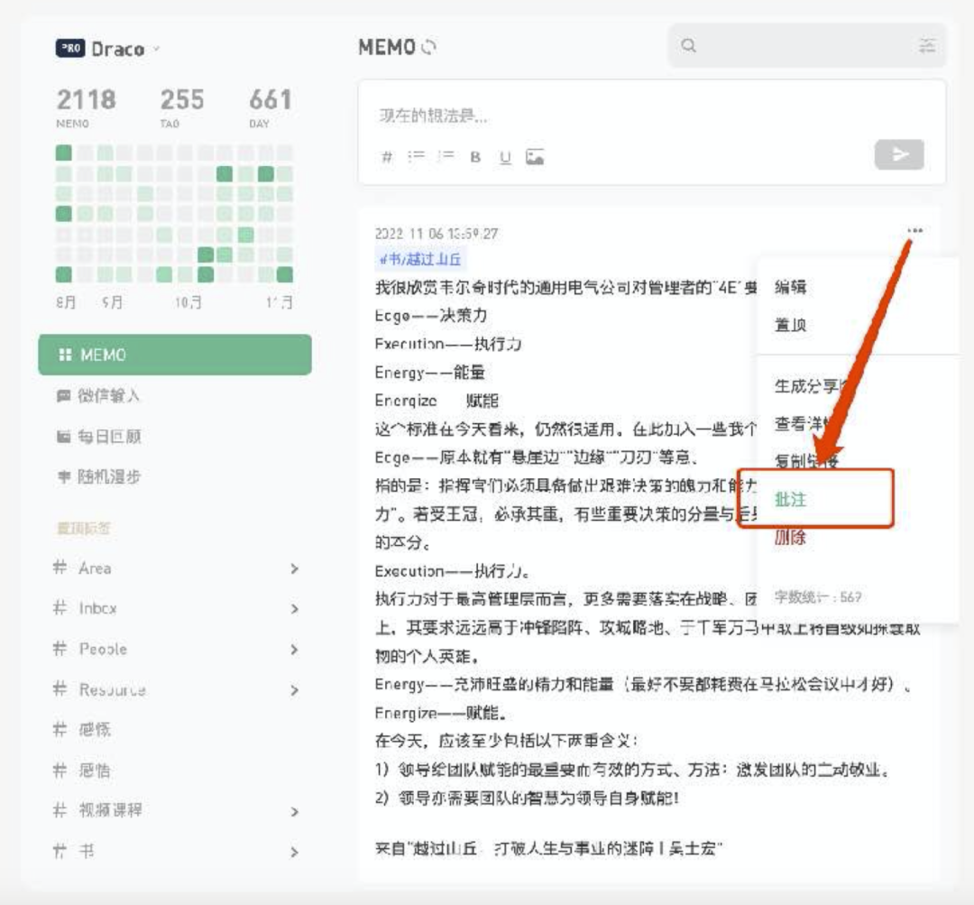 第三步:在flomo里,在分享过来的段落或句子上,将自己的一些感慨、感悟等”批注“出来,作为写作素材。
