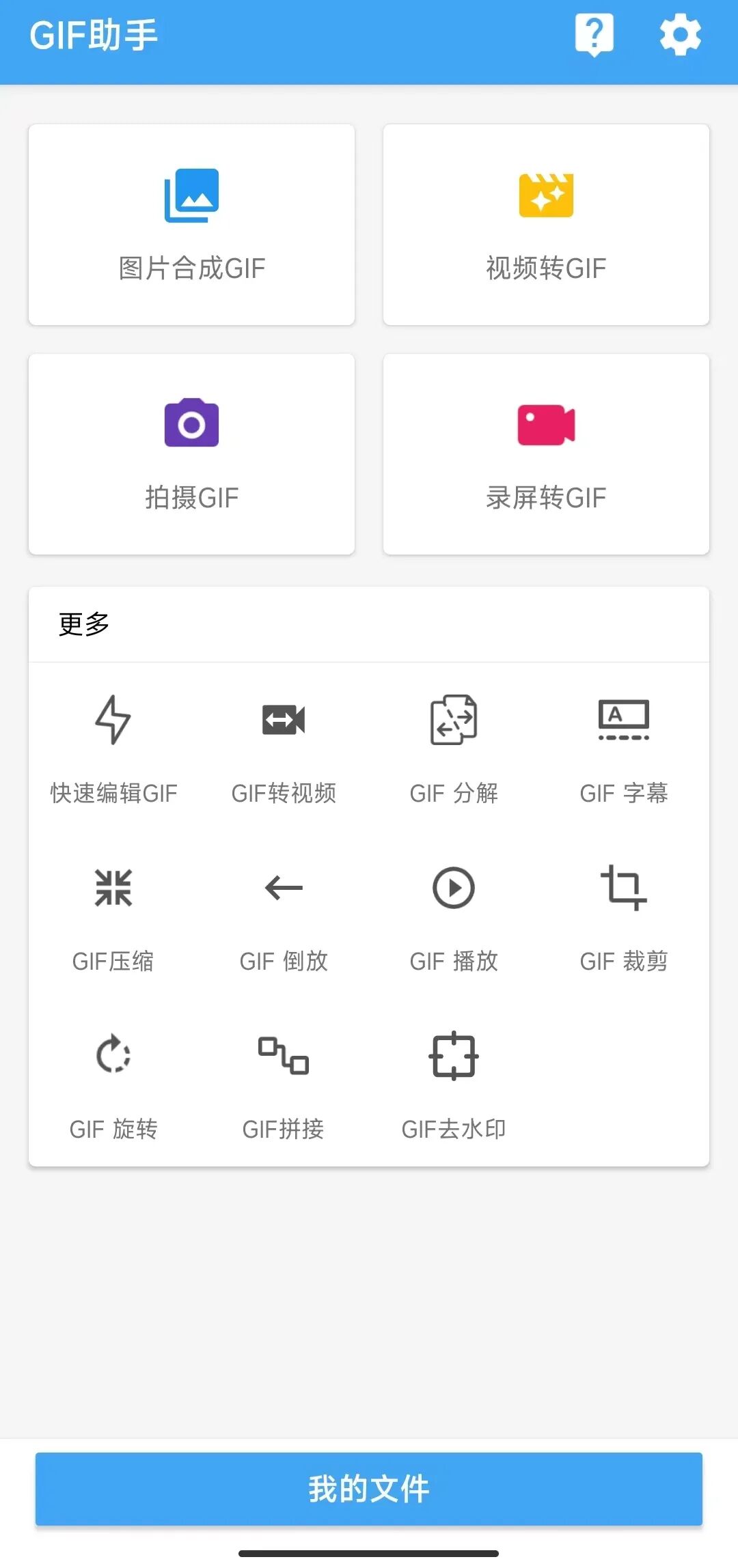 软件的功能有图片合成GIF、视频转GIF、拍摄GIF、录屏转GIF。除此之外,还有快速编辑GIF、GIF转视频、GIF分解、GIF字幕等等11项非常实用的功能。