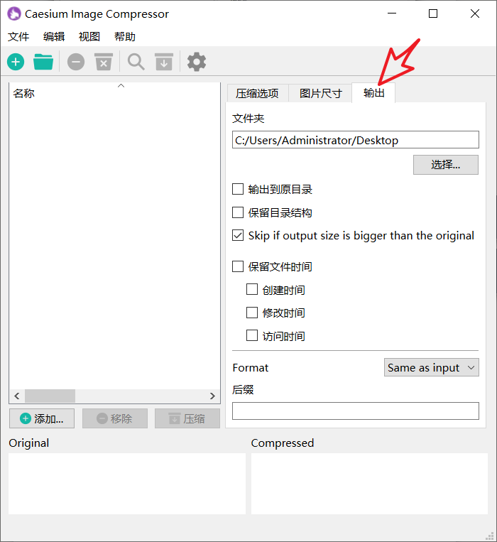 最开始使用,需要先设置图片的存储位置,找到【输出】的按钮,选择图片压缩后存储的位置。