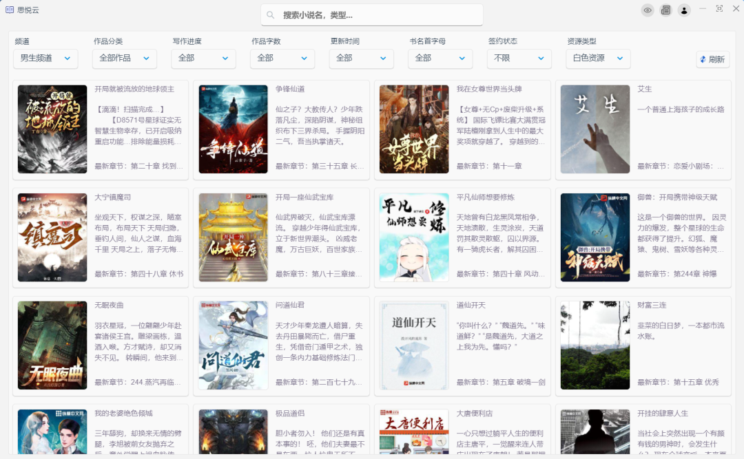 这款软件叫:思悦云,是一款PC端的小说在线阅读器,其完全免费,没有广诰与弹窗,界面清新,分类齐全,拥有的小说挺多的,整体的阅读体验感非常不错!