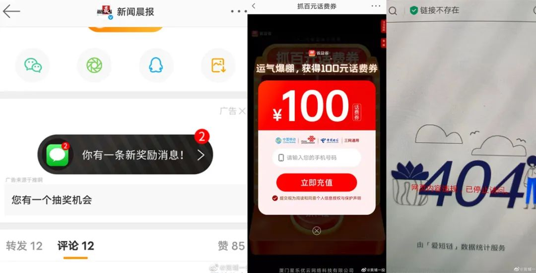 微博用户@黄埔一投 透露,微博发布页面经常会出现一个“你有一笔奖励”点击即进入充值29.9元得100元话费外链,导致很多网友误以为是微博官方为回馈用户做的促销活动,便参与了。然而,在成功扣费之后,却无法打开可以领取话费包的网页链接。