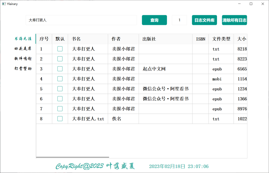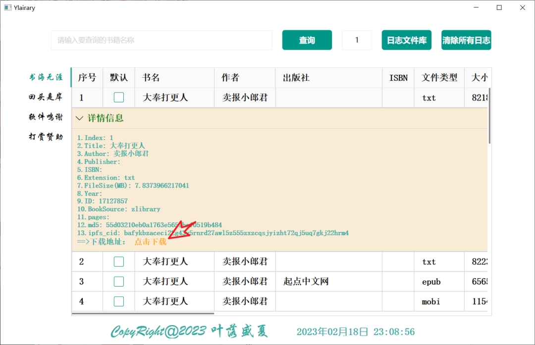 需要什么资源,直接在这里输入书籍名称即可。搜索出来的书籍会显示作者、出版社、文件类型、大小等等信息。题外话:这《大F打更人》据说要拍成电视剧了,有点期待~~~