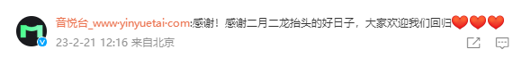 今日,音悦Tai官方再次确认了此消息,并回应称:“感谢!感谢二月二龙抬头的好日子,大家欢迎我们回归”。
