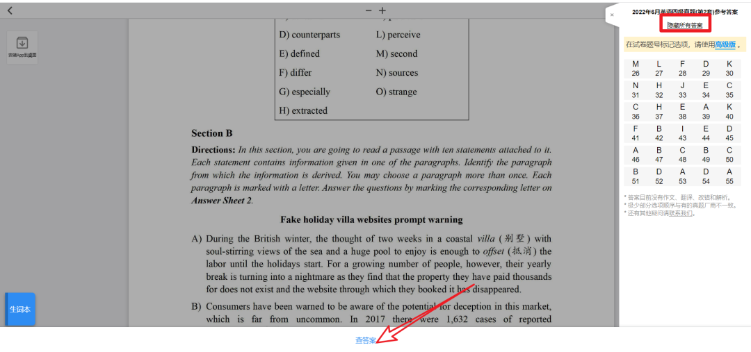 网站适合电脑、平板、手机等,里面包括近年的所有真题。点击【查看答案】,可能在右侧显示和隐藏答案,很方便大家刷真题。