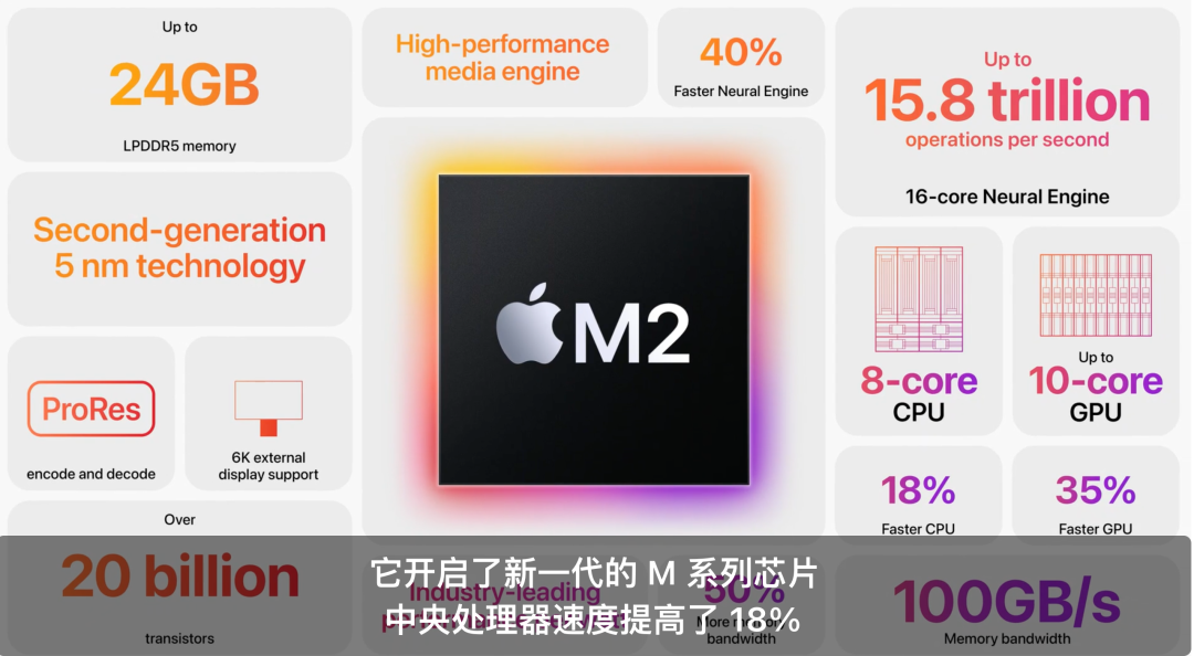 这次发布会的重头戏是更新了M2芯片的MacBook。M2芯片同样主打能效,在保持能耗一样的情况下,相较于M1总性能提升了20%左右。
