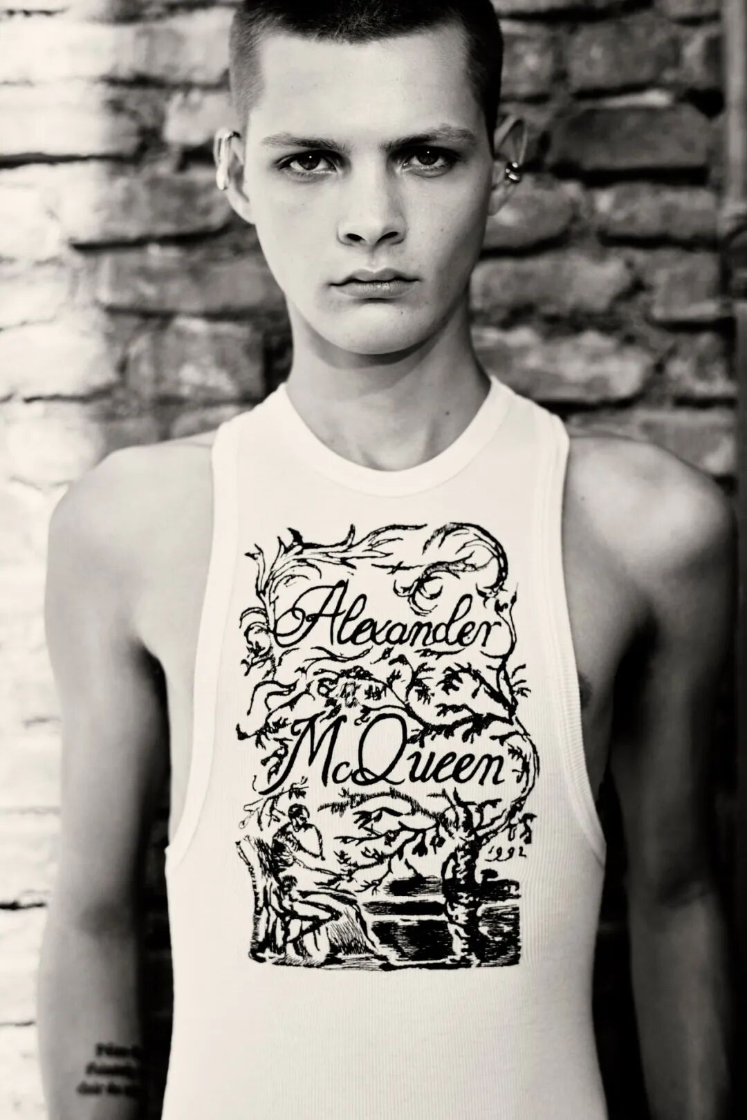 几乎不会有人想到,七十年之后,背心正占据着高级时装的中心舞台。Courrèges的镂空背心将露肤的程度拉到了极致;Alexander McQueen在背心上印制了诗人、艺术家William Blake为但丁《神曲》创作的插图;Vetements将《黑客帝国》的计算机字体铺满了背心,思考现实与虚拟之间的壁垒。
