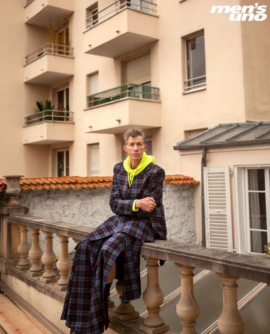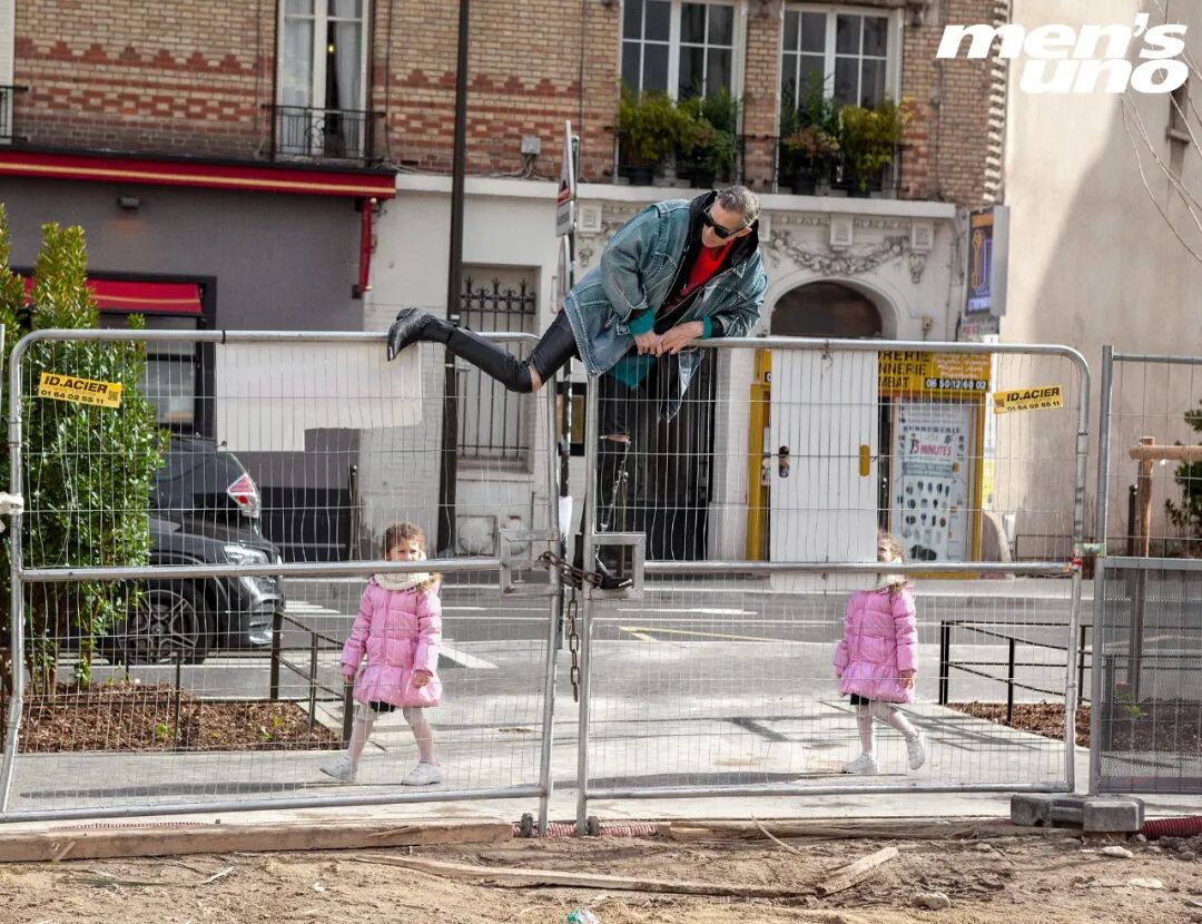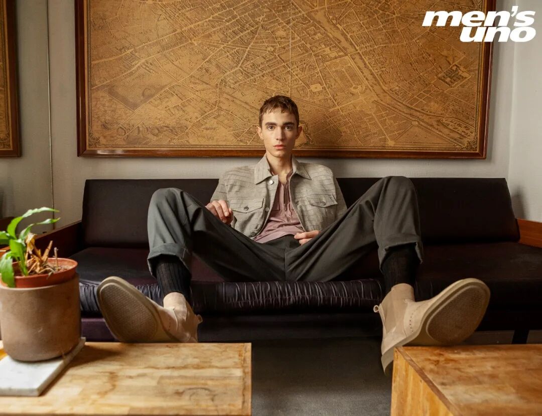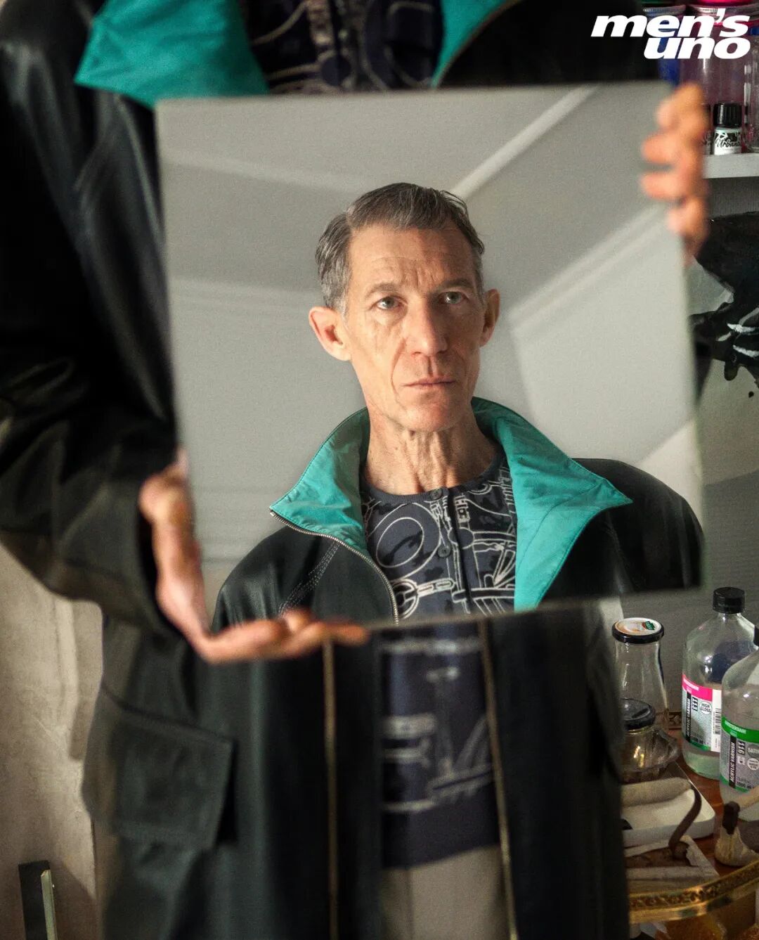灰色皮衣、暗红色丝质T恤、灰色长裤、灰色麂皮皮靴/Hermès