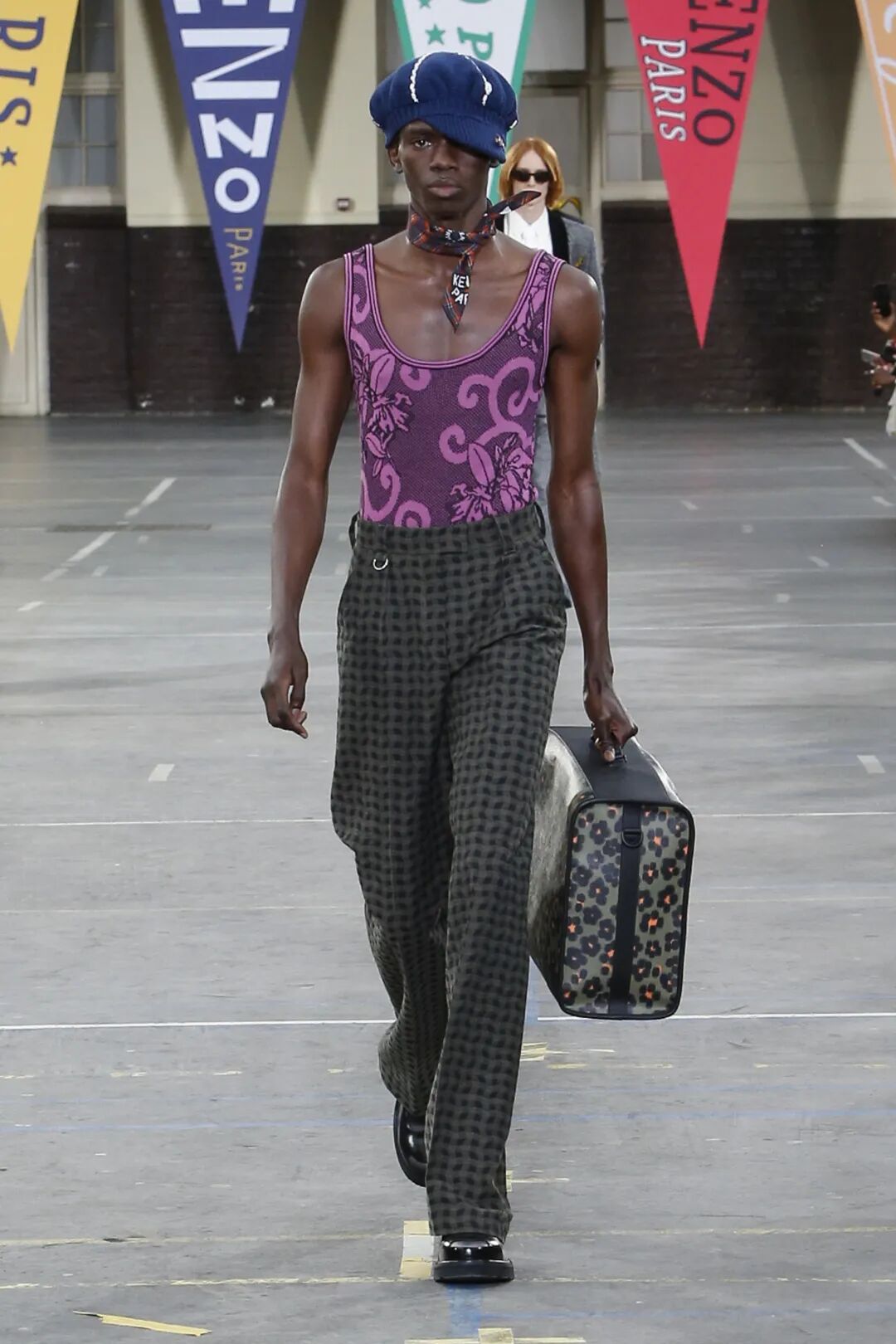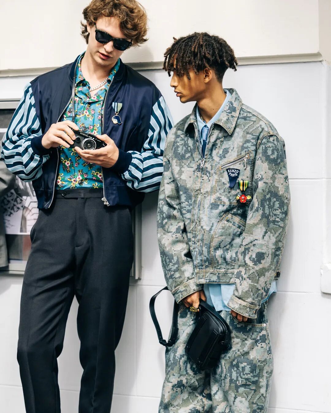 沿袭Nigo在年初品牌首秀时制定的路线,这一次,他依然沉迷于Kenzo的品牌档案。高田贤三曾给人留下深刻印象的印花和图案,在这一系列中得以重现。1992年秋冬的提花图案,被重新演绎为水波格纹(The Wavy Check);1988年秋冬的条纹被扭曲为水波状,以水波条纹(The Wavy Stripe)的形式出现在衬衫、针织衫和西装上;Kenzo三角旗(Pennants)的灵感则源自上世纪80年代品牌标志性的运动风格旗帜;在尼龙、针织和丹宁单品上大面积出现的像素玫瑰迷彩(The Pixel Rose Camo)更是几乎原样复制了品牌的经典印花。