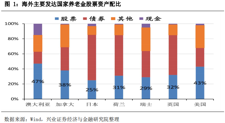 目前保险资产配置在股票上的比重平均只有10%左右,远低于30%的配置比例上限。基本养老金委托社保管理的资产占比目前为15%左右,投资于股票、基金、期货和养老金产品等的资产规模占比也远低于30%的上限。社保基金入市规模不断提升,目前其交易类金融资产占A股自由流通市值5%,已成为市场中不可忽视的力量,但仍具备的提升空间。根据海外经验,成熟养老金保值增值的需求加大将增配权益类资产(见图7-2所示),远高于我国现在的比例。此外,还有企业年金、职业年金、大学基金会、各类社会团体基金会,如美国的耶鲁大学基金会等,在海外都是非常重要的机构投资者,手握“长钱”,又立足价值投资和长期投资,是支撑股票市场长期向好的重要力量。