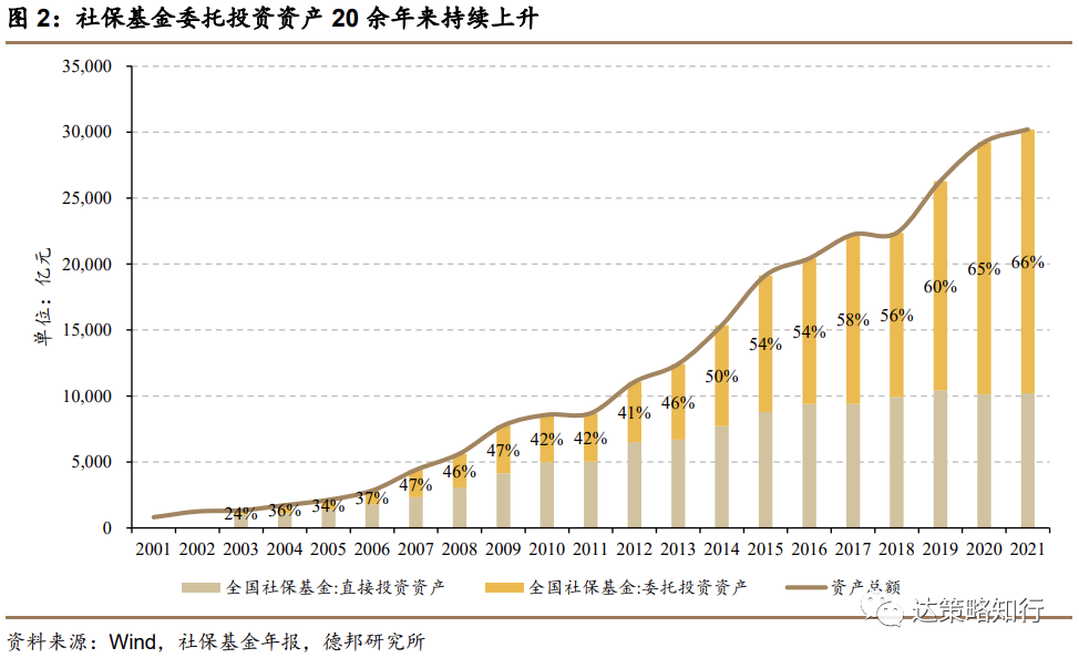 由于上述投资范围区别,直接投资收益率受到天然限制,故自社保基金成立以来,委托投资资产占比便持续上升,截至2021年已达66%。