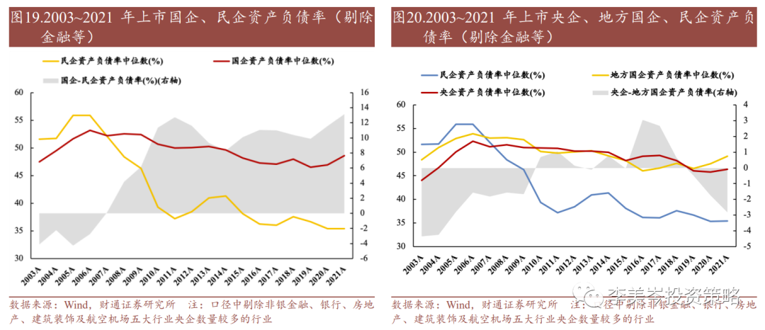 从市盈率变化的角度具体观察国企的“低估值”现象,可以发现,2003~2021 年 A 股国企上市公司市盈率中枢波动与民企类似,但相较民企有较为显著的折价。从国企内部结构来看,地方国企总体估值比央企更低。