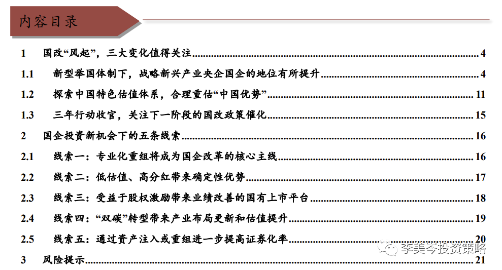 当前,新型举国体系、中国特色社会估值体系建立健全在即,“三年行动”收官,国企改革即将迈入下一阶段,国企央企的发展将被赋予新的动能。抓住国企改革带来的国央企投资机会,以下五条线索值得关注:(1)专业化重组将成为国企改革的核心主线;(2)低估值、高分红带来的确定性优势;(3)股权激励目标下国企有望出现的业绩改善;(4)“双碳”转型带来产业布局更新和估值提升;(5)通过资产注入或重组进一步提高证券化率。五条线索中,专业化重组和低估值高分红更需重视。