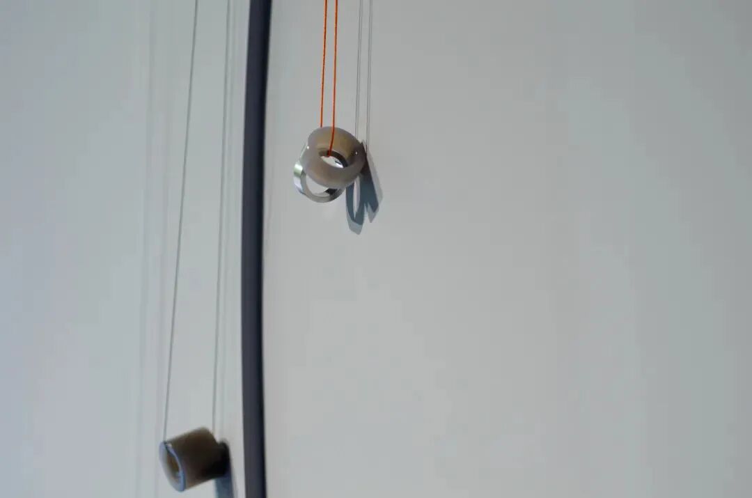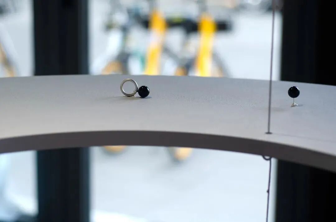 吴:楼下的展品中,有一件是斯青在前言中提及的黑玉髓和珍珠结合的作品。玉髓底座的部分,就可以通过贴身佩戴,在衣服的掩映下呈现半隐匿的状态。也在如何佩戴的问题上,提供了一种“开放性”。吴:环环相扣的结构,如果佩戴,无论指尖或者身体的任何部分,随着身体的律动,环的结构也就相应可动。斯青戴的那款戒指,还有另一个全银版,但这个版本的珠体是空心的,目的也很明确,让律动自如;因为如果直接浇铸为一个实心球,体量倍增的同时,律动性也就被无形降低了。吴:其实就是锻造。但锻造的逻辑,势必限制量产;为了更突出律动性,有时候,就要取舍。张:确实,这个特别有意思:它自己就是一个生命体,它自己有自己的解剖结构,它不只是一味拿来——因为这儿需要一个圆形,然后就有的简单圆形。它有属于它自己的自我,有自己的壳,有自己的内部;也许我们带上它,它还是它自己,这就很有意思。而且还有一些意外,就是你视觉上你会觉得这个珠体是大的,但你拿到它,在手上,其实很轻,一种错觉。