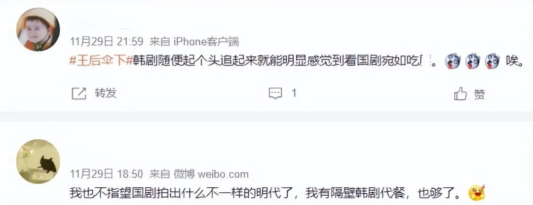 ——《王后伞下》评分都能有8.2,《如懿传》就只有7.5,这种对比甚至让人觉得《王后伞下》的无知台词有了另一种含义,有些人确实就一心只想吃泡菜呢……