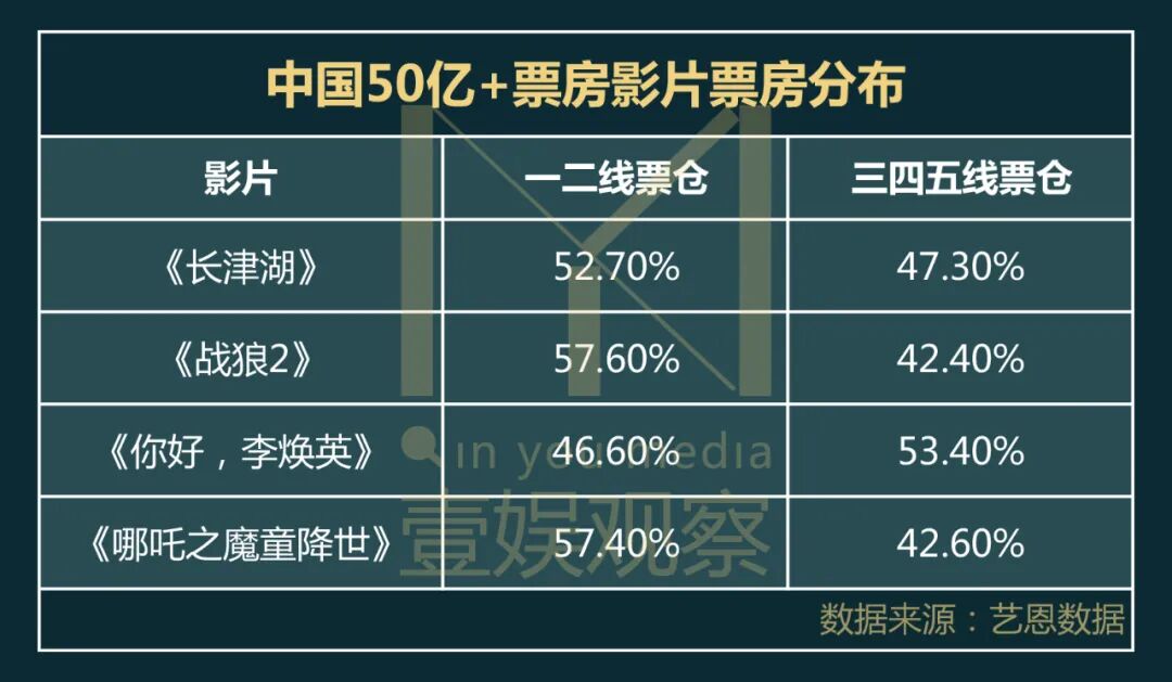 其次,50+亿影片的票仓分布需要让一二线主流消费市场与三四五线下沉市场保持均衡,才能完成票仓的突破。