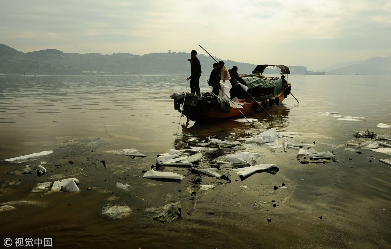 2011年12月21日,福州铝厂工人将过滤纸抛向江中,吸附浮在江面上的“油脂” / 视觉中国