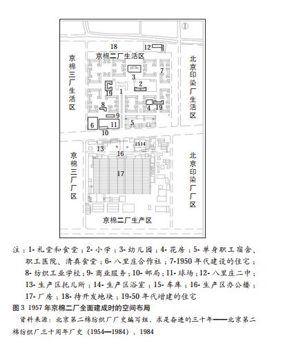 以北京京棉二厂为例,幼儿园、托儿所、中学、浴室、食堂、单身公寓、住宅、厂房、办公楼,从出生到死亡,一条龙服务。