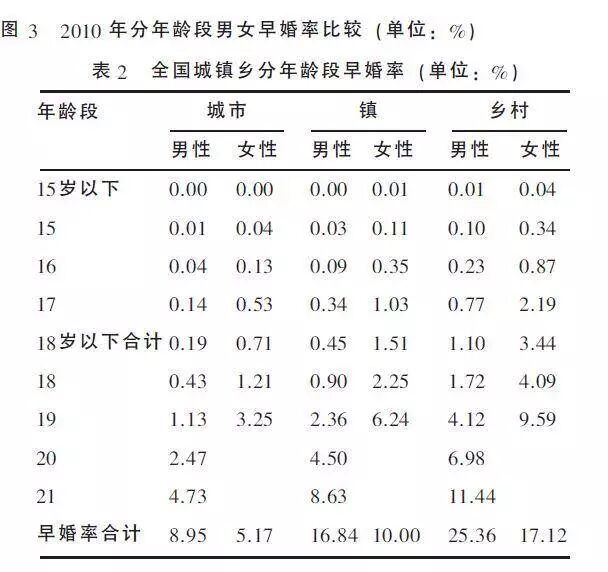其次,中国农村早婚妇女集中主要在20岁以下低年龄段,未成年就结婚的情况比男性要严重得多,是同龄男性早婚率的3倍之多。男性总体早婚率(16.6%)高于女性(10.85%),其实是因为男性在20和21岁早婚的比例较高,占到66.47%。