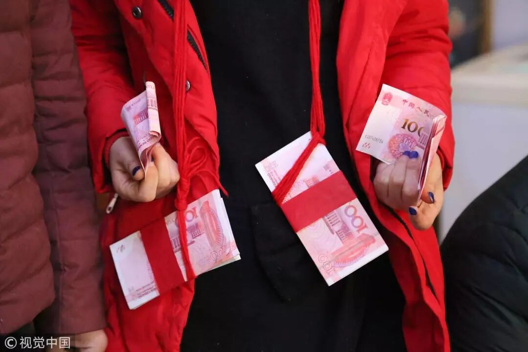 2017年甘肃平凉,某农村一小伙为娶媳妇准备10万元彩礼到媳妇家提亲,西北人将彩礼钱称之为“离娘钱”,现场还将一部分钱用红线绳拴起来挂在媳妇脖子上,此举被称为“栓媳妇” / 视觉中国