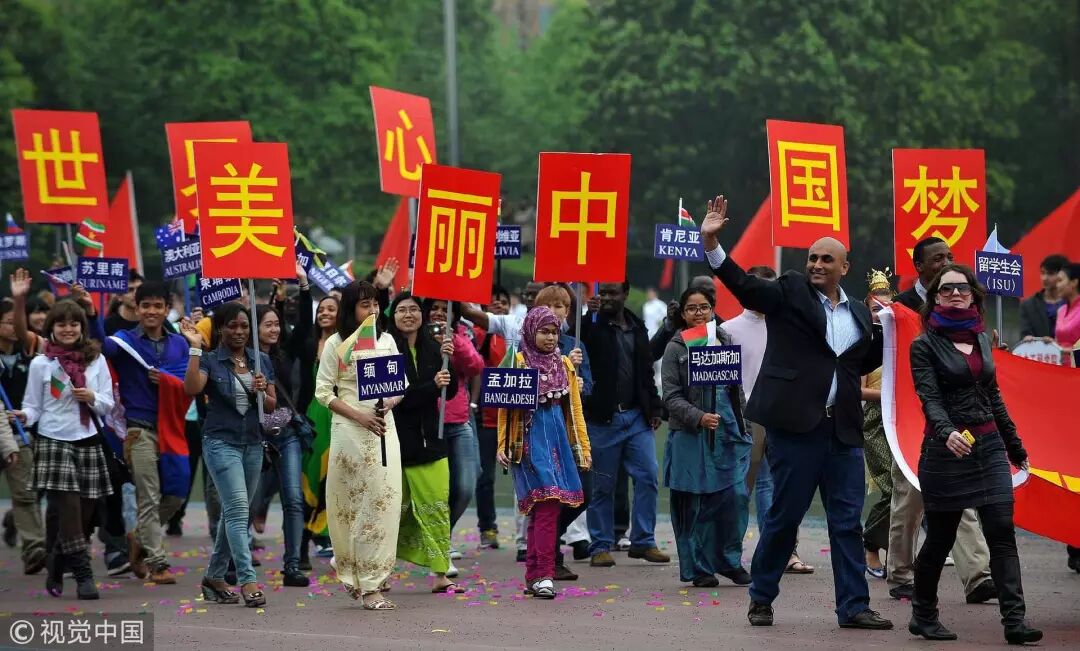 2013年4月12日,重庆大学运动会开幕式现场,留学生表达对中国的热爱。不知道在他们是否被各自的祖国算作就业 / 视觉中国