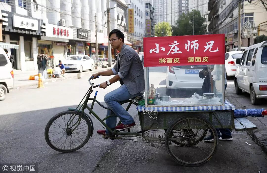 2015年9月23日,陕西西安,西安交通大学研究生庄栋放弃世界500强企业部门主管岗位及20余万元的年薪,在校门外卖凉皮 / 视觉中国