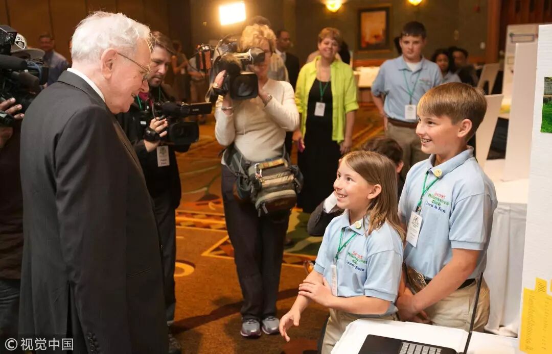 当地时间2015年5月18日,美国奥马哈,巴菲特会晤美国年度儿童创业大赛“创业成长竞赛”的决赛选手 / 视觉中国