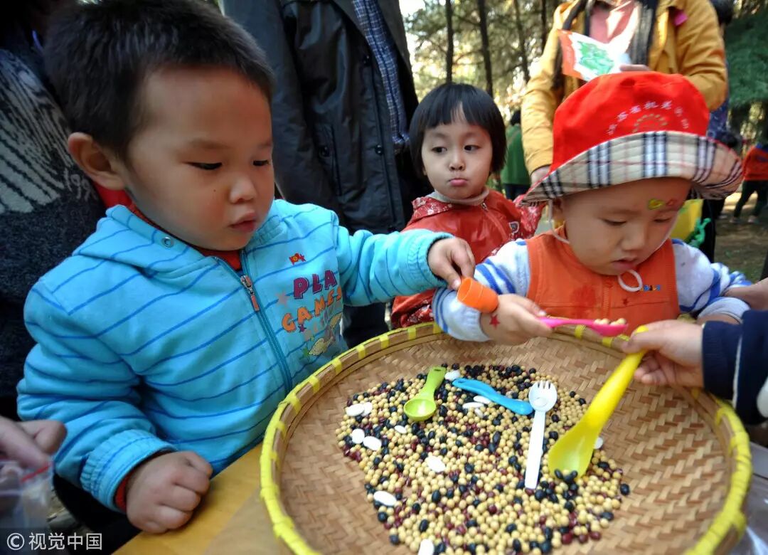 2014年11月3日,南京,江苏省级机关实验幼儿园将“秋·实”校园文化活动搬进南京古林公园,近千名孩子与家长一起摘蔬果、磨豆浆、滚南瓜,在大自然中感知秋天的丰硕与美丽 / 视觉中国