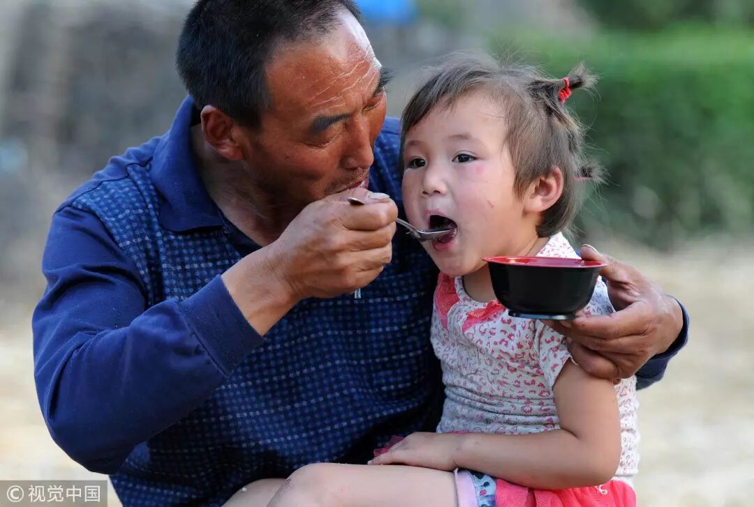 2012年6月9日,山西运城,一位爷爷抱着小孙女,小心地给她喂饭 / 视觉中国