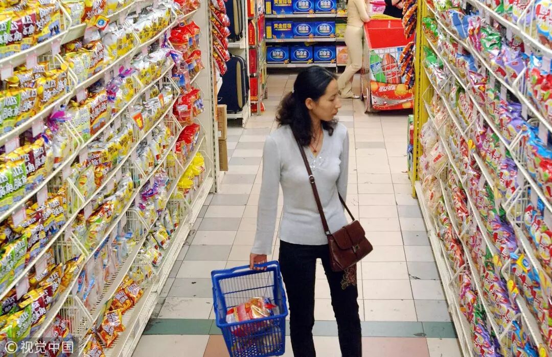 2004年9月24日,一女士正在郑州某超市的膨化食品区选购薯条、薯片等小食品、儿童食品 / 视觉中国