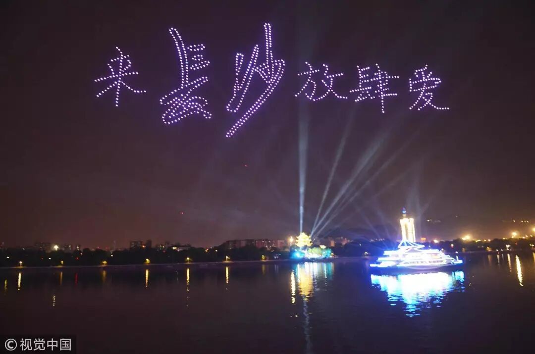 2018年8月10日晚,长沙市橘子洲头,777架无人机盘旋在空中变换着各种造型,打造大型告白现场。用长沙话跟北方人表白,一点也不难懂 / 视觉中国