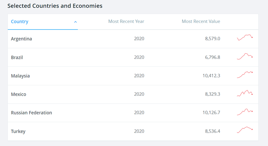 我们熟知的那些主要发展中国家大国,全部都遭遇了一万美元现象,下图是我在世界银行官网截取的,俄罗斯,马来西亚,墨西哥,土耳其,阿根廷,巴西,他们全都至少曾经人均超过一万美元,但是后面又跌回去了或者说停滞不前,2020年的疫情只是让这个情况雪上加霜而已。