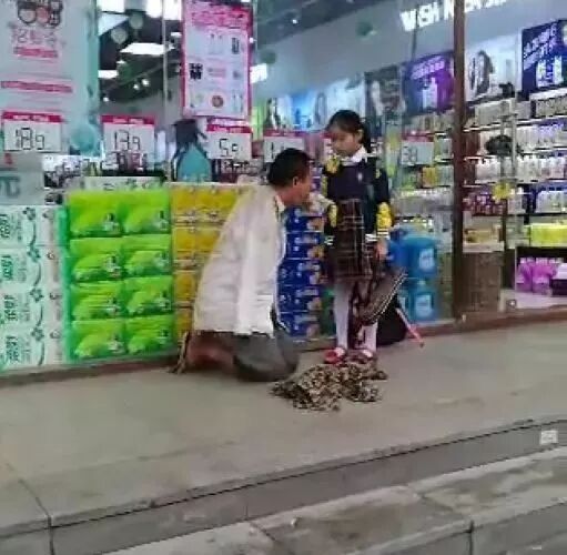 就在这时,她看到了感人的一幕:一位身穿校服的小女孩正在给街头一位失去双臂的流浪汉喂面包。女孩喂得很认真,流浪汉吃得很急切。