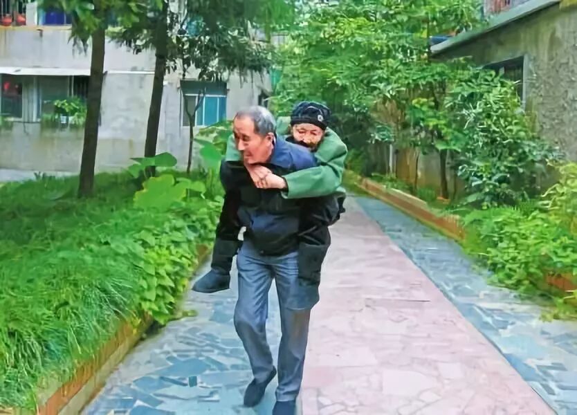 吴国秀把毯子取下来,用剪刀一分为二,再用针把两端缝上,缝成一条带子。随后,吴国元弯下腰,吴国秀把背带从妈妈腋下穿过去,绕到哥哥胸前,再绕到妈妈身后,牢牢地兜住妈妈的臀部。吴国元小心翼翼地背起妈妈,把带子紧紧地系在腰上,背着妈妈往楼梯间走去,老人高兴得像个小孩,乖乖地将头贴在儿子背上。