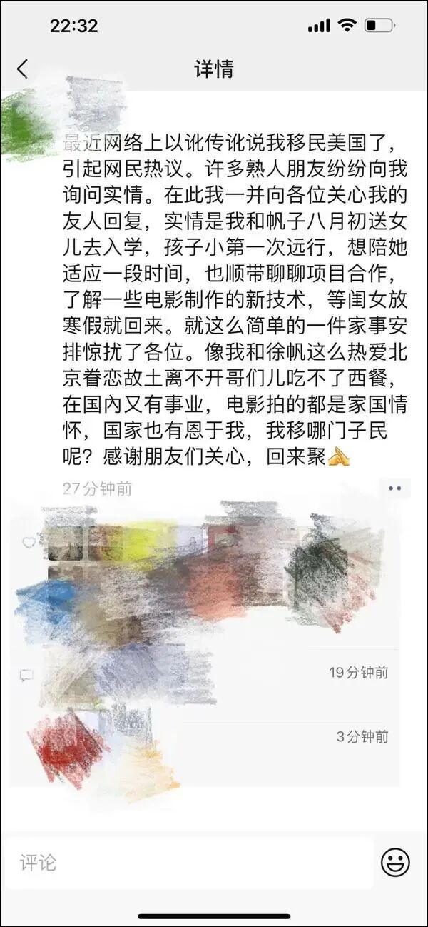 “最近网络上以讹传讹说我移民美国了,引起网民热议。许多熟人朋友纷纷向我询问实情。在此我一并向各位关心我的友人回复,实情是我和帆子八月初送女儿去入学,孩子小第一次远行,想陪她适应一段时间,也顺带聊聊项目合作,了解一些电影制作的新技术,等闺女放寒假就回来。就这么简单的一件家事安排惊扰了各位。像我和徐帆这么热爱北京眷恋故土离不开哥们儿吃不了西餐,在国內又有事业,电影拍的都是家国情怀,国家也有恩于我,我移哪门子民呢?感谢朋友们关心,回来聚。”