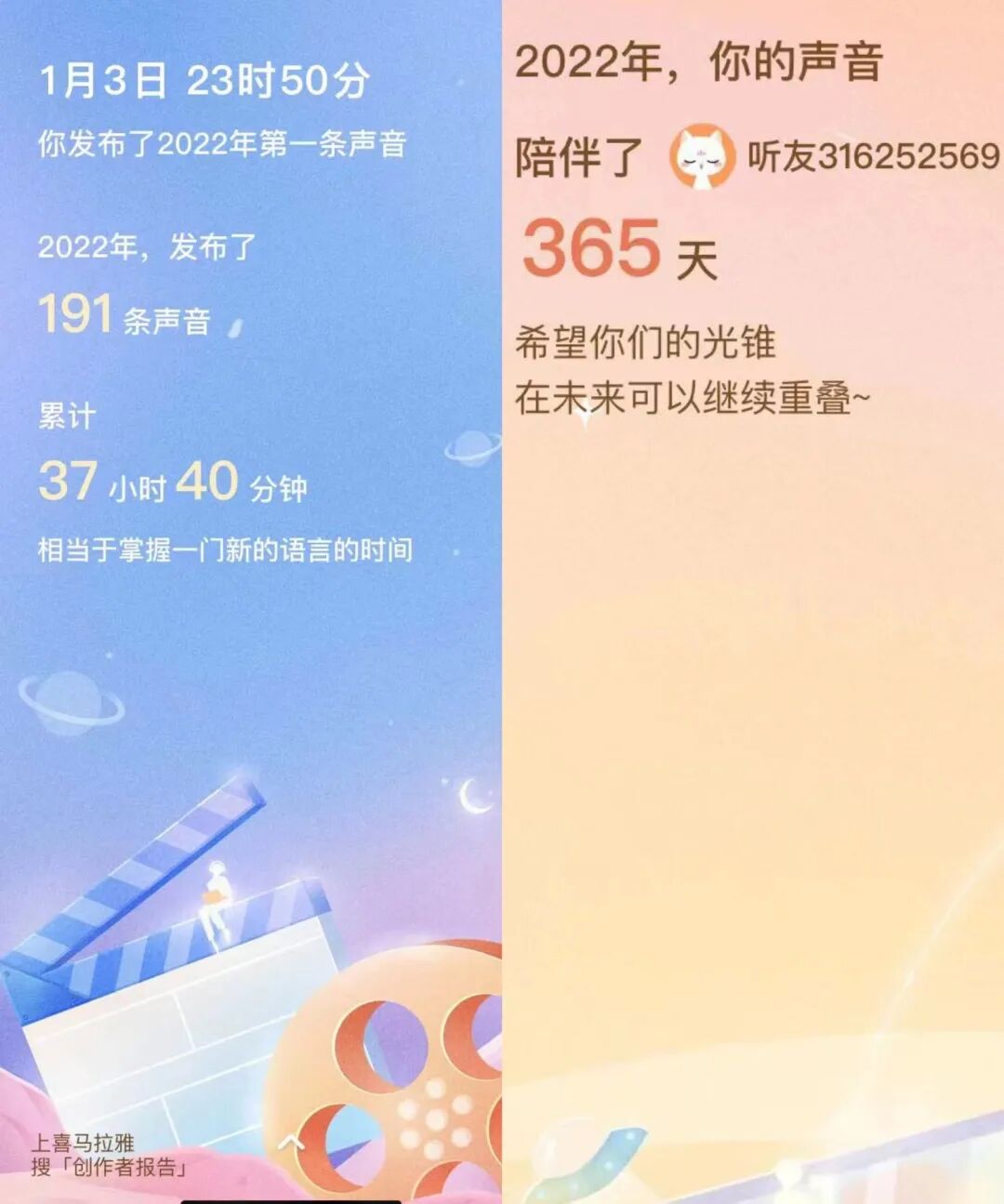 近来,酒馆收到日常上传音频的平台之一喜马拉雅发来的创作者报告,2022年,我们发布了近200期的免费节目,累计时长相当于“小白”掌握一门新的语言的时间。