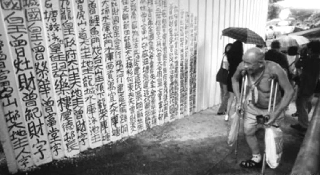 1997年6月30日,距离香港回归前的最后时刻,整个世界的目光都聚焦在气氛凝重的港督府外,突然一个瘸了腿的邋遢老头拎着毛笔和墨汁,在城墙下足足写了几个钟头,终于写满了整面港督府外墙!