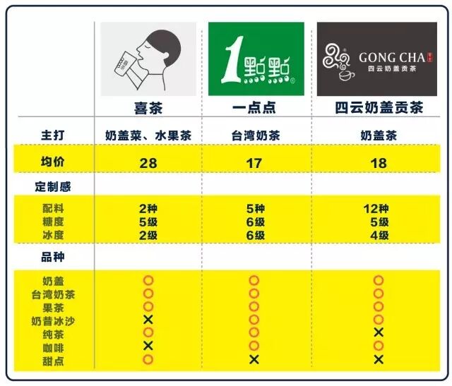 如今,奶茶的江湖上飘着三大长老:喜茶、一点点、四云奶盖贡茶。他们在不同领域各有所长,为了方便大家辨别,我们又做了一张图: