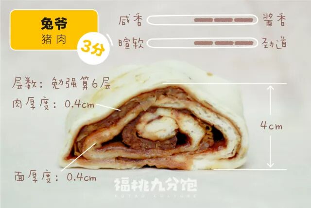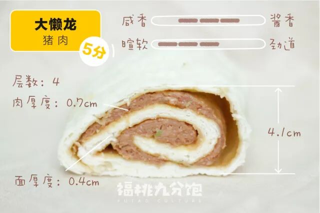 兔爷的懒龙是此次测评里层数最多的,面皮比较薄,比较适合对面食无感,热爱肉食的朋友。肉馅是酱油调制,没有什么酱的味道,据店里师傅讲,肉馅会搅打十分钟左右,所以尝起来还是比较有颗粒感,另外也能尝到比较明显的姜味,口味整体还是比较偏淡。